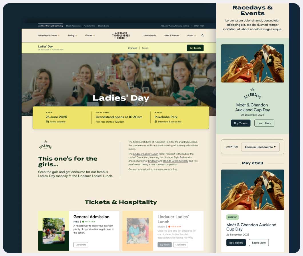 Interactive wireframes enabled real-time feedback and iteration, shaping a user experience that feels intuitive and effortless—whether discovering upcoming race days, exploring hospitality options, or booking an event.